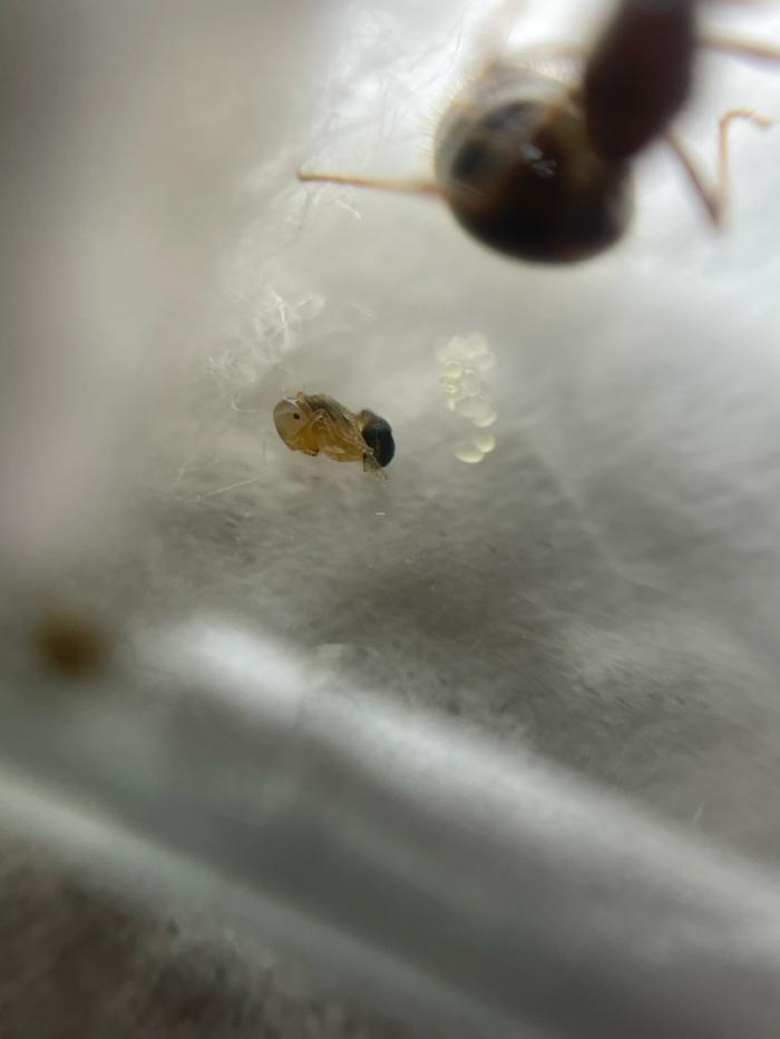 Сейчас в этой семье лишь одна матка, но у нее уже есть куколка! Матка довольно агрессивная, при открытии пробирки сразу пытается напасть и ужалить обидчика.
