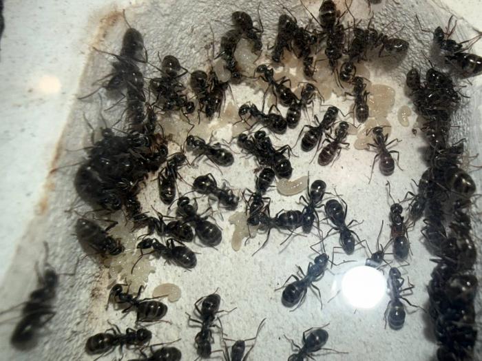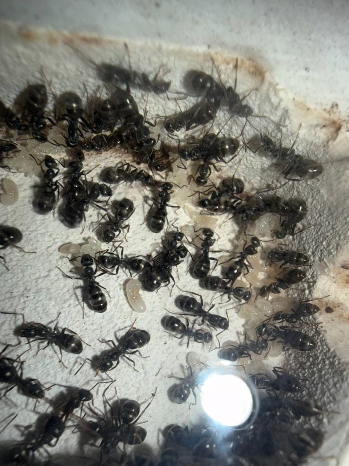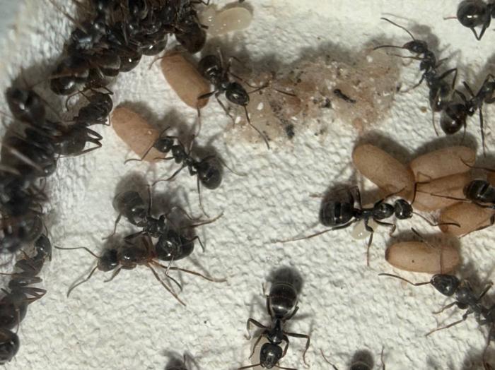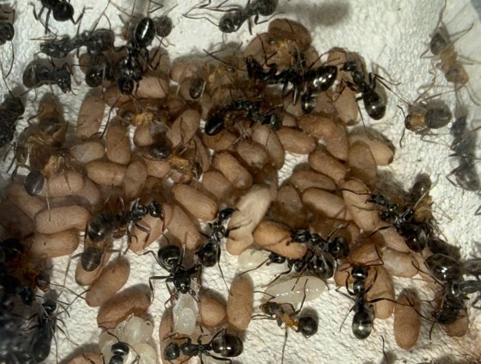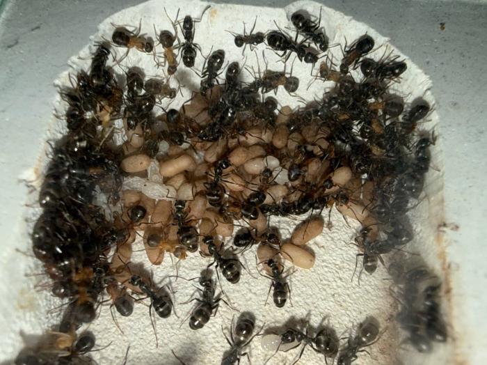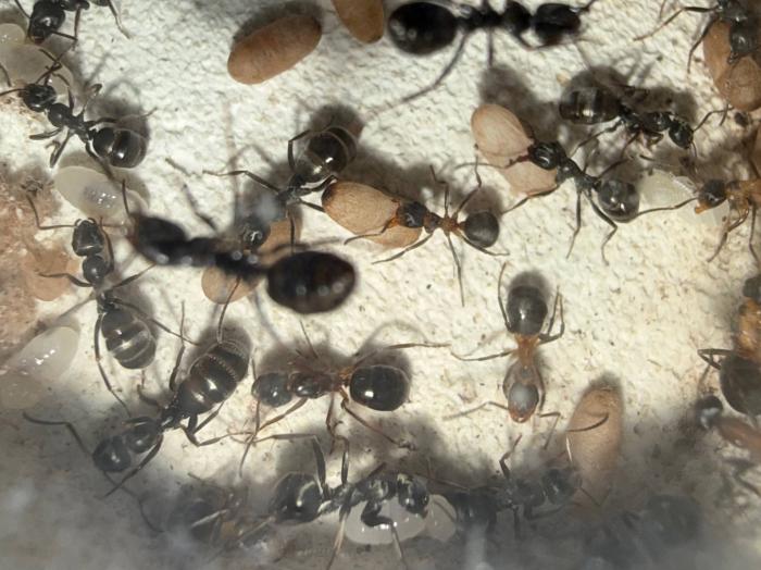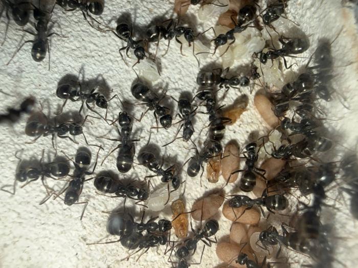 Как уже было сказано в название блога, копты довольно редкие муравьи. Особенно учитывая мое место жительства. Так как же я все таки нашел их? А все получилось очень банально, поехав отдыхать в город возле гор, случайно во время прогулки 10 августа 2025 года, я заметил что-то крошечное, подумал, что может это рабочий сервиформики, но передвигался он довольно нетипично, больше походило на передвижения самки. Я присмотрелся и увидел что и вправду, это самка. На тот момент я не был уверен, что я вообще поймал. Но вскоре покопавшись на просторах интернета, я понял что у меня коптоформика. А вот какая, я не знаю до сих пор. Но сейчас не об этом. После приезда домой, я сразу же пошел искать коконы/куколки сервиформик, ибо их мне было нужно ой как много(с той же поездки я привез 2 трункорумов, 1 пратенсиса и 2 раптиформик). Нашел я тогда их довольно много(около 500-600) и раскинул на всех. Рабочих взрослых я стараюсь никогда не подбрасывать, поэтому я всегда дожидаюсь первых рабочих из куколок, и свежих рабочих подкидываю без заморозки или утопления. С таким способом никогда ещё не было проблем. Так у копты оказалось где-то 200 подкидных куколок и несколько светлых рабочих. Вскоре начали вылупляться остальные сервики. Семья хорошо питалась, но так же, как и остальные формики, никаких яиц до зимовки не появилось(только раптиформика успела вывести первое поколение родных рабочих до зимовки). 24 октября я всех отправил на зимовку. Просидели они там почти 4 месяца. Через 8 дней(23 февраля) у копты появился первый пакет яиц. Он начал постепенно увеличиваться. Начали появляться личинки. И 20 марта у них уже было довольно много коконов. И вот буквально недавно начали рождаться первые родные рабочие(первый появился 7 апреля). Сейчас у семьи уже около 20-30 родных рабочих, очень много коконов, личинок и огромные пакеты яиц. В скором времени планирую переселять их в больший модуль, что бы не ограничивать их рост. Рабочие кстати очень мелкие, сильно меньше чем например первые рабочие формики трункорум(которые тоже недавно появились).