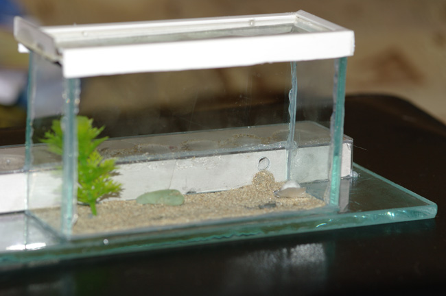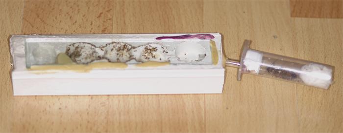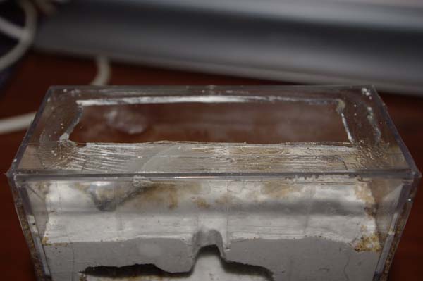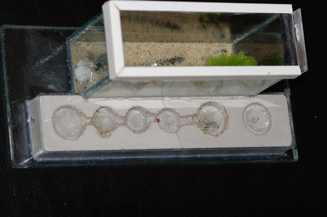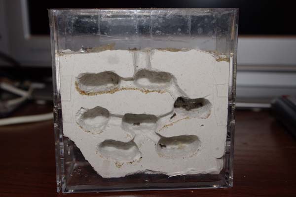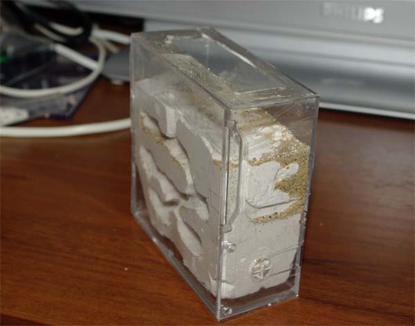 Теперь вставляем в дрель фрезу или сверло (я брал диаметром 8 мм) и высверливаем в гипсовой болванке камеры со всех боковых сторон. Ножом прорезаем ходы между камерами и выход на поверхность. Опускаем болванку в стакан и любуемся тем, что сотворили. Теперь сверлим маленькое отверстие диаметром 1 мм в стакане так, чтобы оно оказалось в самом верху полости для воды. Через это отверстие будем шприцом воду наливать. Остальное -- на любителя. Я сделал отверстие на уровне поверхности арены для подключения трубки. В обычном режиме это отверстие закрыто сеточкой и играет роль вентиляции. Крышку для стаканчика я сделал из пластика от коробки CD. Приклеил сверху горлышко от пластиковой бутылки с пробкой. Ну вроде и всё. Ну ещё одно отверстие с сеткой у меня в крышке, для вентиляции. Отворачивая пробку кладу внутрь еду пинцетом. В одном случае я крышку приклеил силиконом, во втором -- пластилином. Флавусов просто прикрыл. Сложно представить, что они начнут разбегаться подняв крышку или будут носиться по арене мешая корм класть. Их вообще на поверхность не выманишь. Вот что получилось: