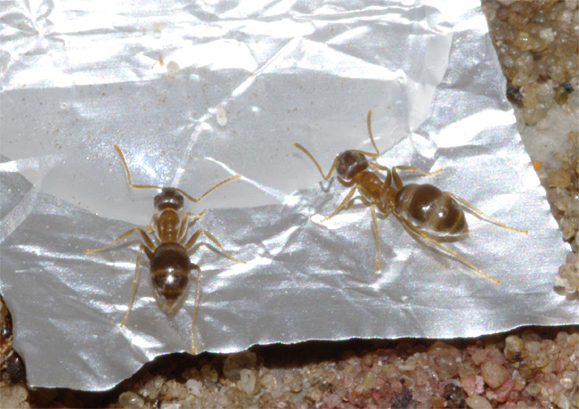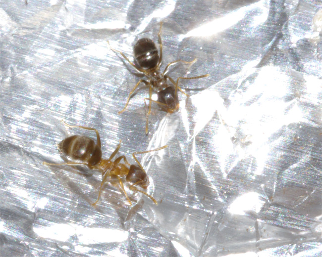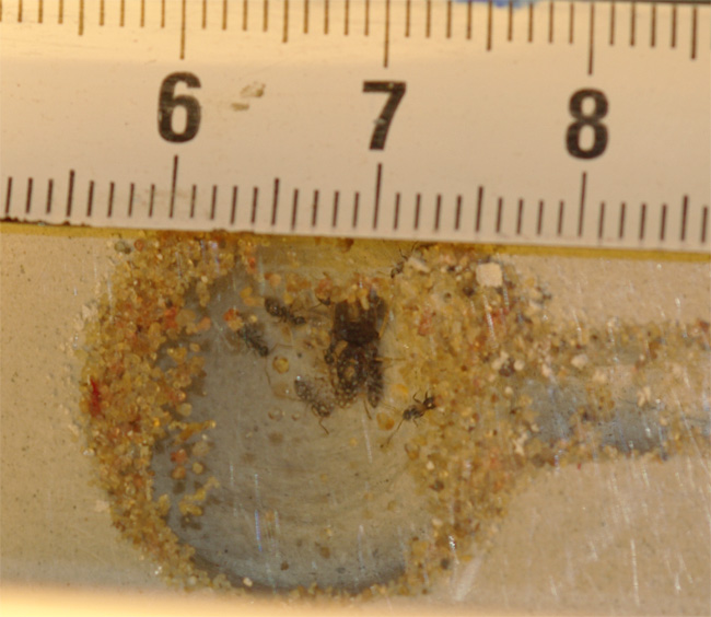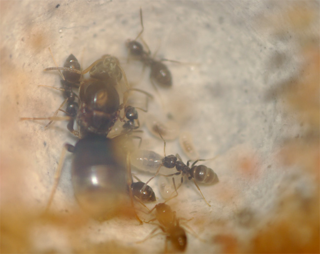 Эта такая же мелкая самка, которую Вы мне показывали в Анапе, когда мы встречались. Мы ещё годали, кто это может быть. Сейчас я думаю, что кто-то из мелких лазиусов. Пока ни один рабочий у неё не погиб. Когда погибнет -- под микроскопом буду определять. А пока пусть живут безымянные.