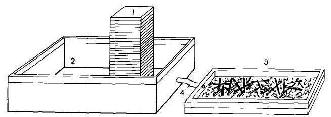 Другой метод содержания муравьев, где естественный материал из гнезда играет только дополнительную роль, рекомендуется Chauvin’ом (1972) для крупных муравьев рода Formica L. Главная часть гнезда состоит из нескольких дюжин деревянных ящиков, покрытых прозрачными плексигласовыми крышками. Размеры ящика 11.5 х 11.5 х 0.4 см. С боку у каждого ящика есть входное отверстие в форме 2-сантиметровой щели. Ящики располагаются слоями один над другим и формируют конструкцию в контейнере, который играет роль арены (рис. 1). Муравьи с готовностью обосновываются в таком гнезде и отстраивают его, используя предоставленные им материалы из природных гнезд этого же вида. Главный плюс таких гнезд – это то, что их наполнение легко регулируется.