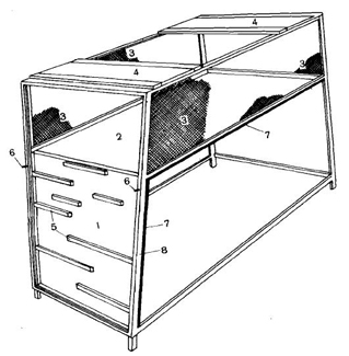 Рисунок 3. Формикарий. 1 – гнездо; 2 – арена; стены и потолок арены из тонкой металлической сетки; 4 – подвижная деревянная крышка; 5 – деревянные разделители на внутренней стороне гнезда; 6 – крепления для непрозрачного покрытия смотровой части гнезда; 7 – деревянные доски, служащие в качестве задней стенки гнезда и пола арены; 8 – деревянная планка, определяющая ширину гнезда (после Freeland 1958, упрощено)