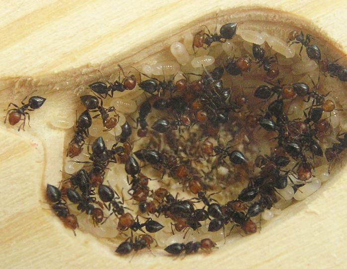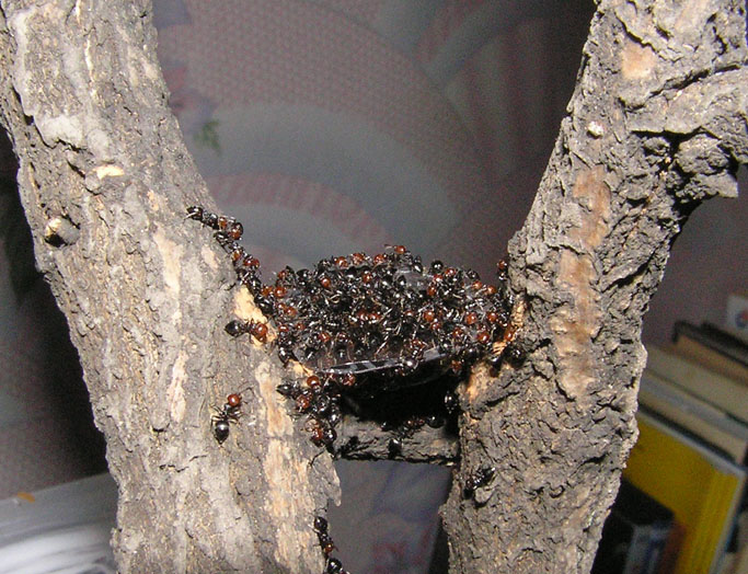 Муравьям там нравится. Более того, они не нуждаются в увлажнении. Хватает той влаги, что рабочие носят из поилки. Арену вернул им самую первую - бесшовный пластиковый контейнер. сейчас там то же самое дерево. Муравьи так же грамотно уминают любые органические продукты.