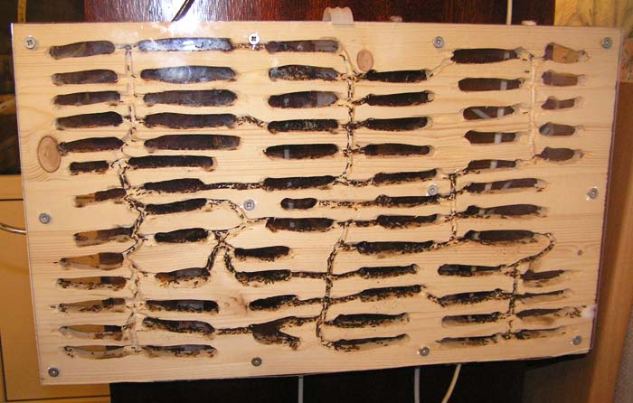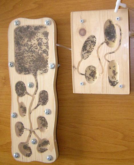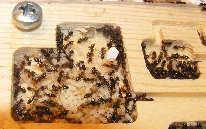 1. Мы переехали. Как я уже рассказывал, не всякий форм подходит крематогастеру. В алебастре они просто не стали развиваться, поэтому переселил их в систему пробирок (см. предыдущие серии). Шло время, и в системе пробирок им тоже стало тесно. Поэтому встал вопрос: куда же их переселить, чтобы они развивались без эксцессов? В этой части хочу сказать "Спасибо" Cyron'у, который когда-то прислал мне деревянный форм для лептоторакса. Лептоторакс там прожил довольно недолго. Его судьбу даже я сейчас не вспомню. Но форм остался. И остался в идеальном состоянии. Самое радостное в этом форме то, что он деревянный, а значит имитирует естественные условия обитания крематогастера. Что ж, сказано - сделано. Колония живет в системе пробирок и деревянном форме.