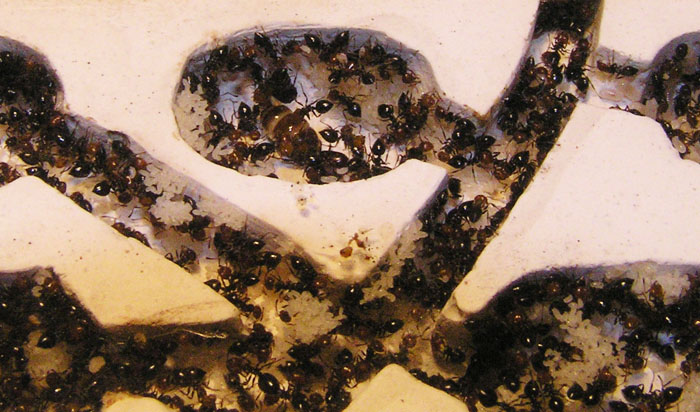 Это была ошибка. Во-первых, я не продумал сам процесс переселения и недооценил количество самих муравьев. Сказать, что их было очень много - значит ничего не сказать. Оказывается крематогастеры очень хорошо адаптируют свои строительные навыки. Они застроили пространство между самой большой секцией и грунтом арены, выстроив перегородку из воска (кормил пчелиными сотами) и кусков яблок. Получилась гибкая стена, удерживающая влагу и воздух. За этой стеной и располагалось основное гнездо. Их там была тьма... Я уже не помню, как удалось их переселить.Во-вторых, буквально в тот же вечер сбежала половина муравьев. Как я уже писал выше, арены должны быть бесшовными. Шов - это путь к побегу. Так выбралась добрая половина всей колонии. Хорошо, что в то время я держал муравьев на балконе, и квартиру удалось спасти от этого бедствия. кого мог, того поймал (ловил до двух часов ночи). Со временем муравьи убегали еще не раз, и в итоге от первоначального количества осталась наверное треть. Приходилось делать такие вот ужасные заградительные барьеры из талька, чтобы как-то сдержать их. Поначалу такого барьера хватало на дня три. Потом муравьи притихли. Может смирились, а может появилось достаточно еды.