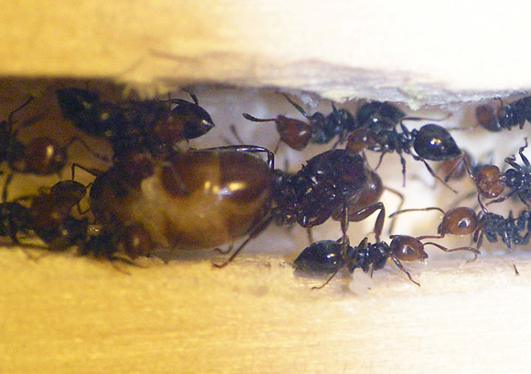 Когда кормлю их сиропом, подбегает толпа нуждающихся, начинают есть, большинство ритмично махает брюшком вверх-вниз. Думал, с чем бы это могло быть связано... Пришел к выводу, что это либо удары по стенкам пробирки, сигнализирующие сородичам о том, что найдена еда, либо своеобразное распространение запаховых сигналов. Больше склонен к первому, т.к. у древесника кампонотуса тоже есть вибрационная система оповещений. Правда кампонотус бьет не отдельно брюшком, а вибрирует всем телом вверх-вниз. Интересное зрелище))) Еще сидел за компом без музыки, думал, что стучит. Потом нашел источник звука - наши лигниперды. Что-то в темноте по стеклу барабанили. Но такое получалось только у солдат. Рабочий слишком маленький.