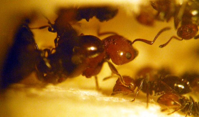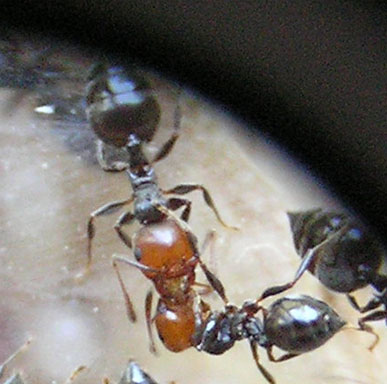 Это так называемые acrobat-ant'ы. Как видно, свое название получили за необычное скрепление брюшка с грудью. Создается впечатление, что брюшко кто-то оторвал, а потом приклеил вверх ногами. Думаешь: "Наверное неудовно так бегать". Но, как видно, товарищи приспособились. Зато такое брюшко очень гибкое, и при нападении врагов муравей очень искуссно выгибает его над головой как скорпион и пытается отпугнуть врага выделениями каких-то защитных желез. Специально я их не провоцировал, чтобы они друг друга этой гадостью в пробирке не потравили.