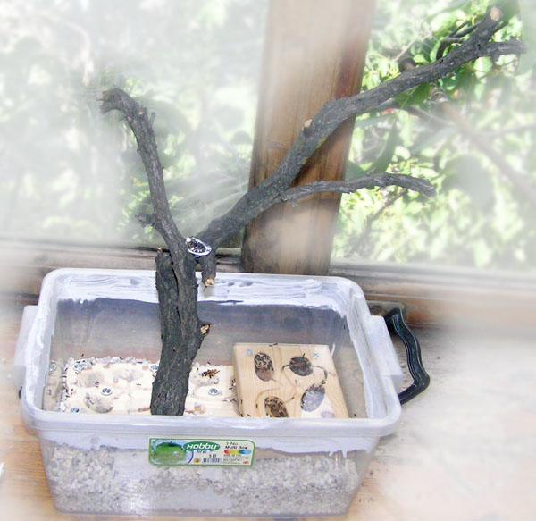 Шло время и, т.к. побегов больше не было, семья росла. Появлась необходимость расширения конструкции. В идеале хотелось сделать гнездо в дереве, но никак не мог найти подходящее полено. Точнее не мог найти никакого полена в принципе. Пришлось использовать старые деревянные секции + небольшой алебастровый форм с хорошей вентиляцией. К этому всему докупил еще пластиковый бокс, площадь дна которого в два с небольшим раза больше прежнего.