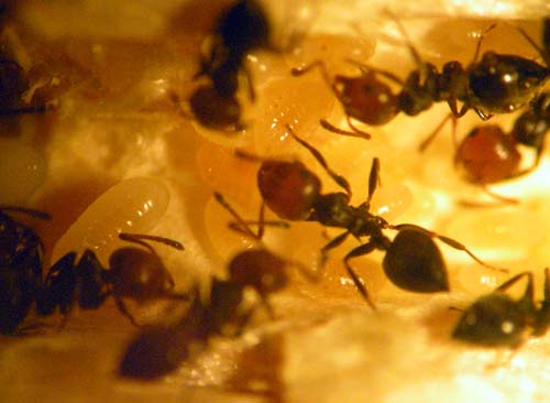 Если крематогастер чем-то занят - например, что-то ест - то он перестает искать пути к побегу. Так я старался занять их поеданием чего-либо на время моего рабочего дня. В качестве "чего-либо" шло все: яблоки, груши, креветки - все, что можно было найти на кухне. все лопалось очень качественно, но колония перестала расти. Остановились личинки, исчезли яйца. Многие камеры были скрыты под слоем песка, и что в их, нельзя было никак рассмотреть. Я во второй раз убедился в пагубности и несостоятельности своего формикария и решил от него отказаться.