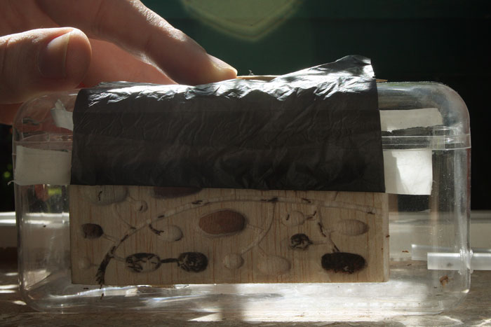 коробка стоит на аквариуме, над лампами, поэтому днём у них стабильно 30 градусов, ночью бывает от 19 до 25. почти в каждой камере теперь есть расплод, в основном яица, есть немножко мелких личинок и несколько довольно крупных, их муравьи постоянно перетаскивают из камеры в камеру и прячут, стоит только дотронуться до коробки.