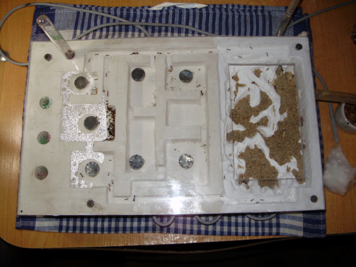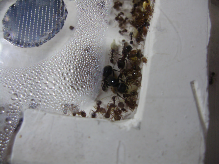 Мураши выбегают из пробирки на арену, самые любопытные начинают бегать по камерам.... Заметил интересную чтуку: в одной из камер один мураш подловил другого, хвать его за ус и давай тащить в соседнюю камеру. Затащил, бросил и побежал дальше исследовать просторы нового домика... Спустя часа полтора активность мурашей увеличилась. Их стало больше носиться по камерам. Ложусь спать. Чтобы ускорить переселение решил на ночь открыть окошко.. В комнате похолодает, пробирка охладится, а в формике будет тепло и сыро). Утром просыпаюсь, включаю настольную лампу: теперь во всех трех влажных камерах на стекле немного конденсата, но всеже не сравнить с первыми испытаниями... Царица со свитой вошкается в одной из влажных камер, парочка мурашей все таки зачем-то еще шариться в пробирке. думаю: Ура! им понравилось! Закрыл окно, пошел завтракать.. возвращаюсь - бац, матка снова смылась в пробирку... наверно свет настольной лампы спугнул... Потушил лампу, снова открыл окно, закрыл дверь в комнату ,свалил на работу...