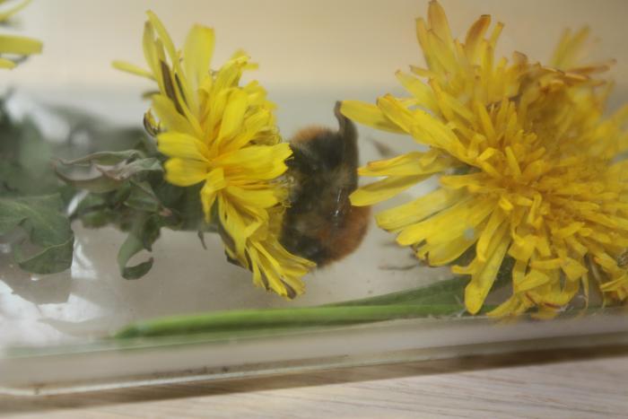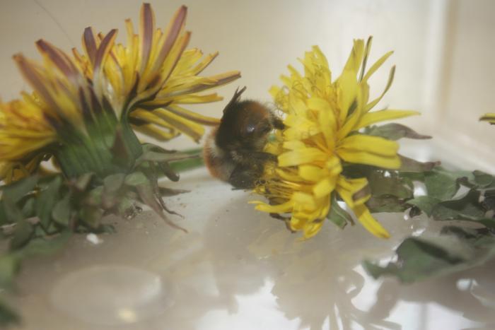 Одну матку выпустил, так как мне 2 колонии шмелей многовато, оставил самую подвижную. Сейчас сходил на улицу, нарвал одуванчиков, после чего, она принялась их "обрабатывать" своим хоботком. Пока вроде всё хорошо ( тьфу, тьфу, тьфу ). Купил маленький скворечник размером 10*10*11 (длина*ширина*высота). Сегодня куплю стекло, вставлю его в одну из стенок, насыплю на дно землю и шмелиный домик будет готов. Собираюсь сделать им место для полётов в расчёте 70*70*70. Этакий стеклянный куб, только одна боковая сторона будет из сетки.