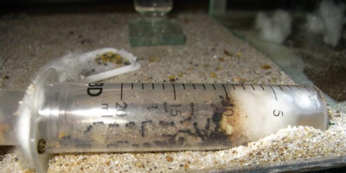 Наконец то я стал владельцев долгожданных мессоров. Прибыли они в обрезанном шприце в довольно таки не маленьком составе - голов 40, много расплода, и даже было два полусолдата довольно таки самоуверенные и грозные ребята. Поскольку в старом шприце их не то что кормить, а даже приоткрыть ватку входа непредставлялось реальным - переселил их в систему из двух 20и кубовых шприцов. Там кормить их стало ненамного легче и наскорую руку склеил стекляный аквариум 25х20х12 см, которая в будущем послужит им ареной. Положил инкубатор туда, насыпал смеси семян для канареек, установил поилку и немного вздохнул с облегчением... Хотя и хозяин говорил что они ели только мак но с кормушки все семена растащили.. некоторые разбросали вокруг а некоторые утащили вовнутрь. Но расслабляться пока рано. При таком жилище - толком понаблюдать не получается поэтому решил делать небольшой формик. Причём хочу одну часть сделать влажной а вторую сухой. Возникает вопрос относительно сухой части формика, можно/нужно ли её делать абсолютно сухой или всё таки нужно увлажнять и её немного ?