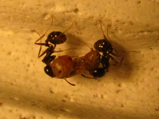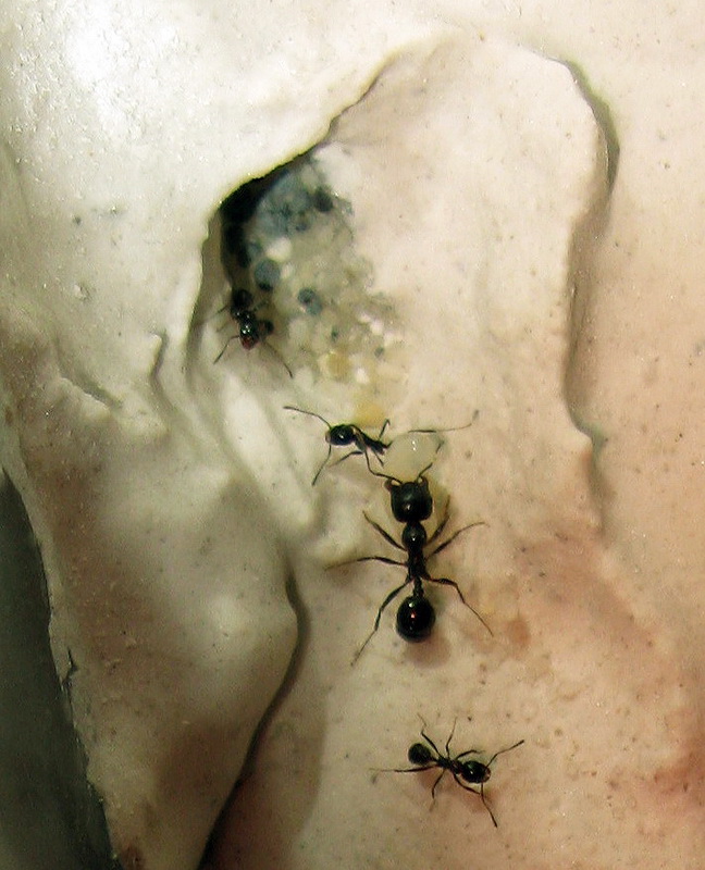 Тройка разведчиков чую что-то новое, не дожидаясь когда подсохнет лепёшка перебирались через временную перегородку (которая ограничивала арену видна на последней фотке выше), и там начали топтать ещё влажный гипс. Один из них тщательно обследовал камеры и ходы, начались попытки массовых переходов. Выждав ещё сутки на всякий случай, доувлажнил часть формикария (слегка перестаравшись), я убрал преграду и в течении часа переезд был завершен. Почему то сухая часть формика муравьёв мало заинтересовала, и до сих пор практически не пользуется популярностью - избытки семян жильцы предпочитают хранить на арене у входа чем в сухой секции. Процесс переселения наблюдал и даже успел сделать пару фоток