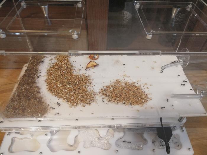 Уважаемое общество. Столкнулся с проблемой. Никак не удается выгнать колонию в новый дом. Мой старый гипсовый форм был уничтожен фактически, изгрызен вдоль и поперек и не радовал глаз. В итоге в антпланет по согласованию со мной была реализована концепция модульного формика. Арена сверху размеров 50х25х20, к которой подклбчены горизонтальные секции 50х25 в количестве 2х штук, поначалу, и с возможностью их увеличить до скольки нужно. Секции соединяются между соьой силиконовыми трубами 15мм диаметром. Все это долэно стоять в красивой тумбе... Но на момент переезда тупо стоит сендвичем рядом со старым формом, и новая арена соединена со старой ареной. Старый форм отключен от всех систем жизнеобеспечения, от обогрева и увлажнения. Но огромный кусок гипса сцобака очень медленно пррсыхает, и расплод пока не перенесен в новое место. А теперь внимание вопрос - каким умеренно разумным геноцидом можно заставить матку, нянек и расплод перенести в новое место? Включение отопления и увлажнения привело к тому что переехала часть рабочих из штатных обитателей арены, и все. Жду ваших советов.