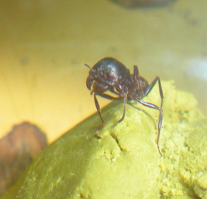 зато уже под конец труженечества обнаружил гигантского солдата, я таких муравьев в жизни не видел.. у нас такие не водились никогда.. бегал вяло очень правда, но он был такой большой по сравнению с обычными большими и юркими, что я его пока искал посудину даже держал во рту (так в детстве делали наверное все кто хотел кисленького) так как боялся ему лапки оторвать (руки мокрые и потные были), собственно скажите что это за вид может быть