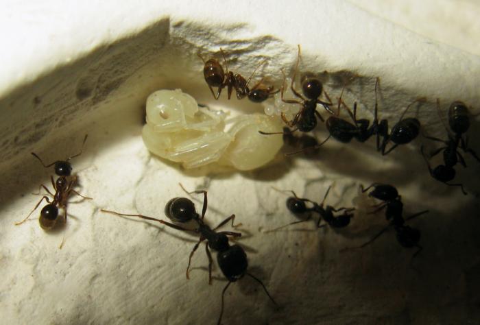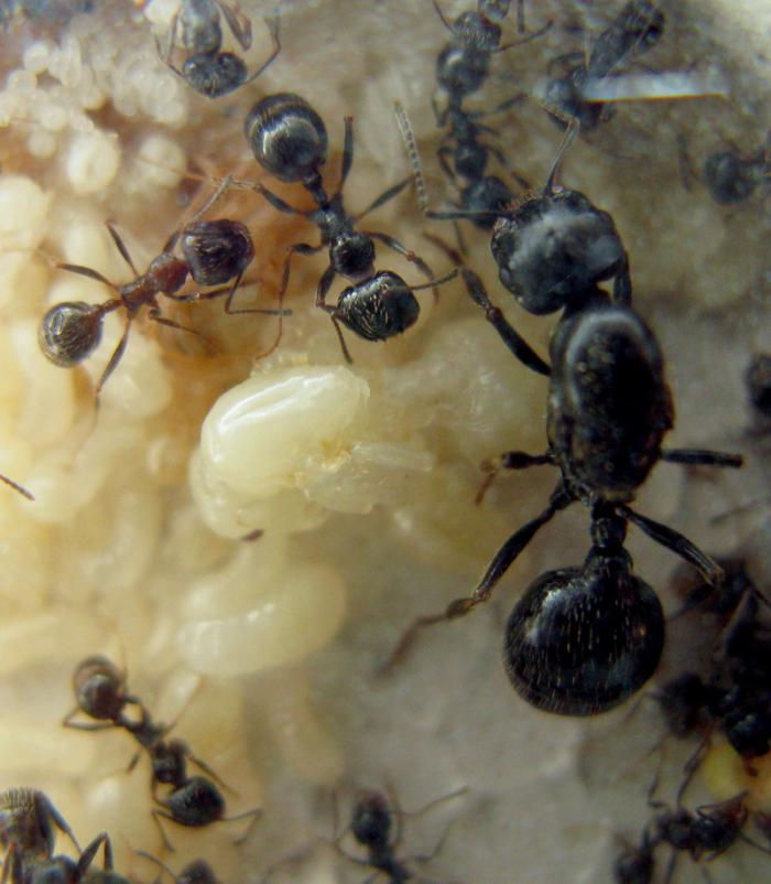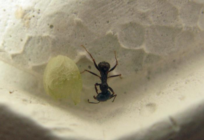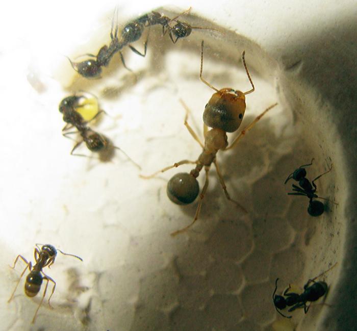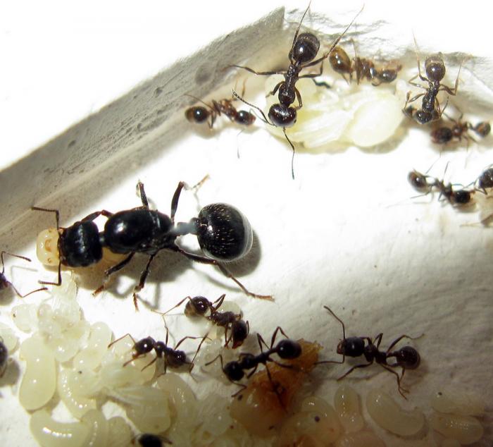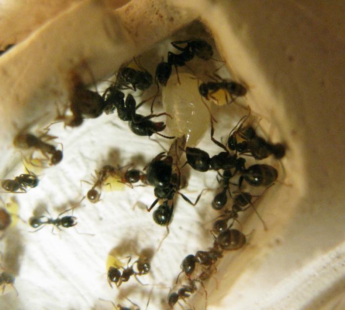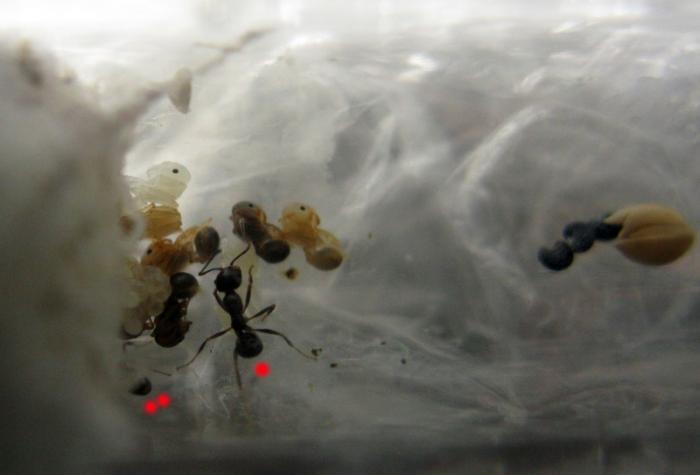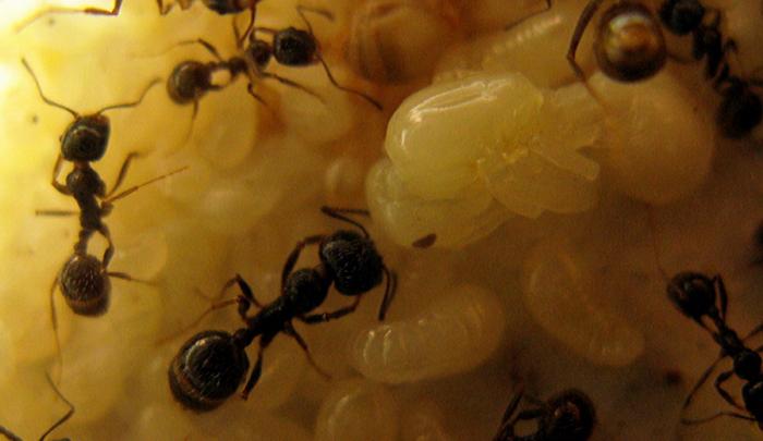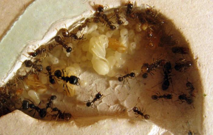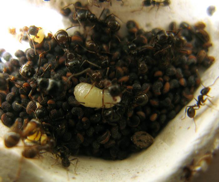 Чтобы отпразновать и поддержать новую семью, было выделено пару раздавленных семян проса и немножко мака, также дал кусочек таракана. Учуяв свежее "мясо" матка оставили расплод на старшую няньку, и побежала проверить причину беспокойства. На тараканий окорок набросилась с аппетитом, потом пошла проверить всё ли в порядке в яслях и снова вернулась к дичи, тем самым дав мне возможность сфоткать молодёжь и расплод, потому что обычно она прикрывает своим телом расплод а молодые пытаются прижаться к ней поближе.