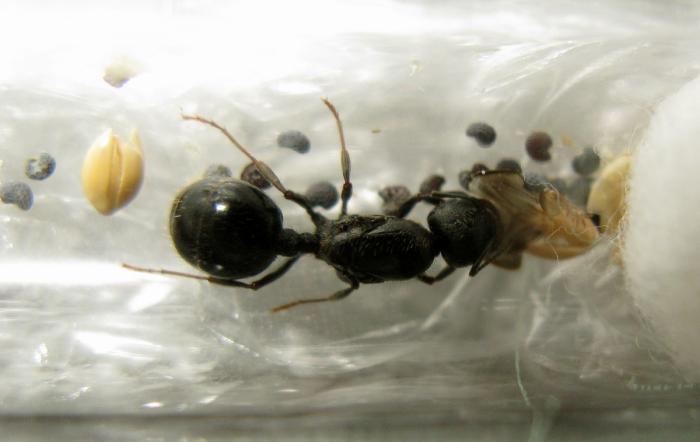 Когда ватка закрывающая вход в пробирку была убрана, в разведку сразу ломанулось 5-7 скаутов и начали изучать "большой" мир. Кто начал неистово тянуть травинки, кто щупал кусочки сверчка, ну а семенами они были уже знакомы поэтому их сразу хватали и тащили (хотя не всегда в сторону дома :) )