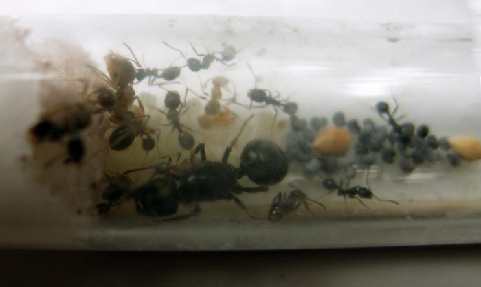 Прожили на этой миниаренке они без малого 4 месяца. Когда пробирка высыхала - я им предлагал новую, они неспешно туда перекочевывали. В один из таких случаев они решили не перезжать в свежую, а разделились - в старой осталась матка с расплодом и запасом зерна. Так на арене появилась третья пробирка, поилка - и места совсем не осталось. Пришло время идти дальше...
