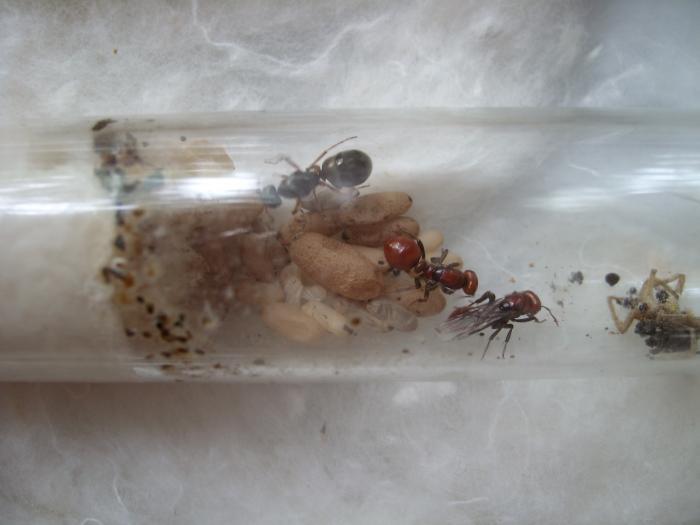 Интересный у Вас "салат в пробирке" получился. Надеюсь, они уживутся вместе. Крупный кокон лучше убрать, т.к. он будет бесполезен. Я бы еще отсадил отдельно и крылатую матку амазонки.