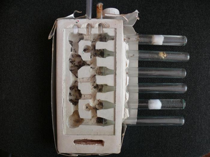 3-я колония (самая неблагополучная) - 2-е матки (одна захлебнулась из-за протека в ватке, ночью. Было 3-и сначала). В крышке, которой заткнут носик шприца, обнаружил дырочку. Из-за этого, за ночь ватка потекла. Сегодня поменял но дырку не обнаружил. Потекло опять. Одна матка, от греха подальше (наученая горьким опытом), теперь всё время сидит у выхода, и боится подходить к влажной. Вторая матка была обнаружена в луже с водой без признаков жизни. Достал обеих. Пока заплавлял заглушку, первая не слезала с ватки, чистила усики и лапки, периодически косясь на меня, и называя меня "безолаберным кретином" - я с ней согласен. Вторая, после просушки очнулась и укусила меня за руку (виноват, каюсь, заслужил). - (Не кормил, и не буду).