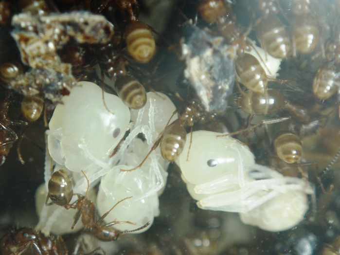 Спасибо, даю сейчас мух в основном (эффектнее всего муха с одним оторванным крылом, и бегает шустро, и жужжит, и не улететь ей), иногда сверчей (когда не лень в магазик за ними ездить). При такой численности колонии муравьи очень смелые и работают без суеты, методично... распятие, отгрызание конечностей и головы, разгрызание на части, смешивание с зерновым пюре пюрешки из мухи, ну и кормление личинок...