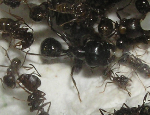 Вчера, перед тем как идти спать - заглядываю к Мессорам. Тихо, спокойно. И вот, замечаю - сидит солдат среднего размера, в позе "брюшко под себя". "Как матка во время появления яиц," - подумал я, и был крайне удивлен немыслимо удивлен, когда из конца брюшка постепенно стало появляться что-то белое! Через пару секунд солдат, как ни в чем не бывало, уже держал в мандибулах только что извлеченное яйцо из своего брюшка! От этого зрелища я просто не мог оторваться. Обычное яйцо, обычных размеров, рожденное солдатом! Через полминуты яйцо было отнесено в глубину камеры, где находится большое скопление рабочих. Немного о солдате: Солдат размером около 9-10мм, но очень заметная отличительная особенность - его (или все же ее?) брюшко гораздо шире чем у собратьев, прямо круглое почти. Присмотревшись, у пары других солдат брюшко тоже шире чем у большинства. Еще заметил, что они в обычных условиях двигаются не как обычные муравьи - ходят аккуратно, продумывая каждый шаг...