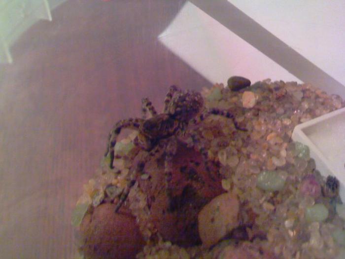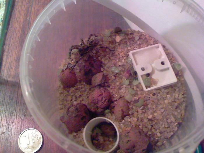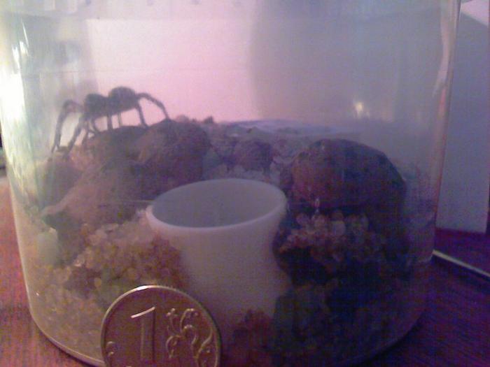 По случаю взял пару мраморных тараканов, одного муравьям скормил, а второго паучку) Скакал он на нем наверное минут 15, пока я таракана не прищемил, дальше он его затащил в нору-колпачок и с тех пор почти не выходит, оно и понятно- брюшко раздулось больше груди и стало как шарик. С таким рюкзаком наверное месяц может не есть.