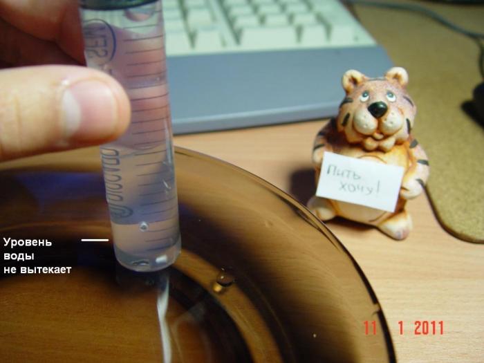 Несколько раз проводил испытания в обычной тарелке... очень занимательно.... Оказывается верхнее отверстие перекрывать водой не надо. Вода перестает вытекать при расположении отверстия где-то на 1см от поверхности воды. Если поднимать шприц выше из воды - подача возобновляется. Тут что-то с вязкостью воды и атмосферным давлением, вероятно. Кто там физику учил - подскажите точнее....