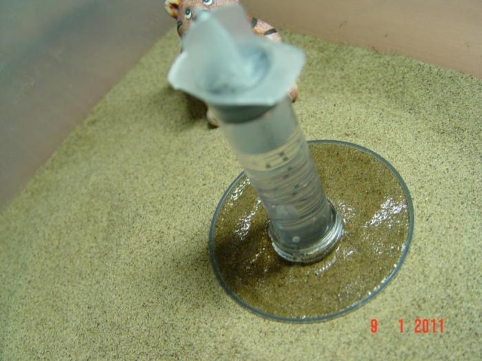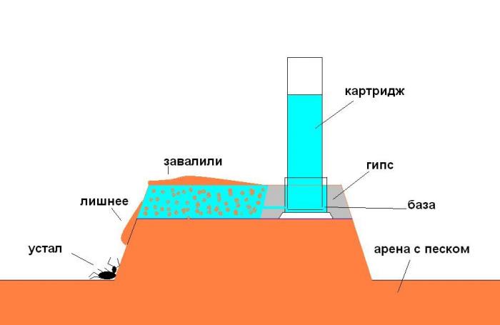 SLY, в вашем случае, конечно, можно не мучиться, а просто купить птичью поилку, сразу при зарядке насыпать в неё песка и поставить на арене где-то на пригорке в таким расчетом, чтобы "лишняя часть" приносимого мурахами песка просто сваливалась с пригорка вниз и тогда вода не будет уходить в арену.