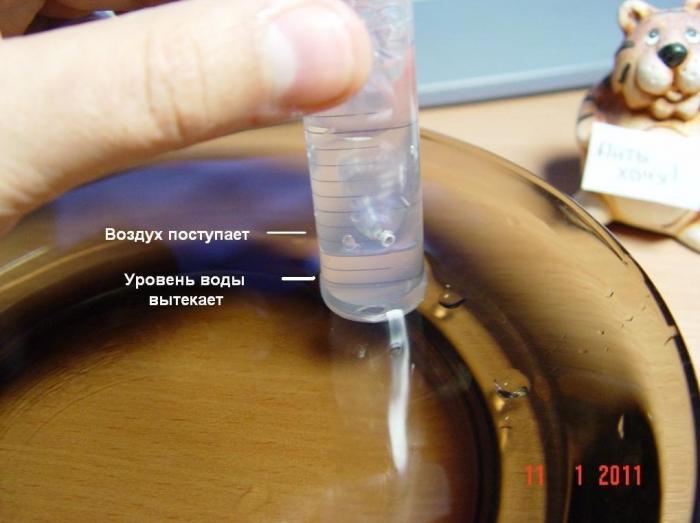 В общем, когда водичку из блюдца отпивают до уровня отверстия- в отверстие попадает немного воздуха, давление воздуха в шприце при этом немного увеличивается, давит на воду (разность давлений меняется) и немного воды опять вытекает, при этом система опять приходит в равновесие.
