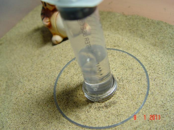 Т.к. в блюдце находятся камушки, то если отверстие на самом дне, то воздух туда просто так не попадет, т.к. муравьи до дна не смогут выпить из-за камушков. Вода в блюдце попадает за счет капилярных сил, которые появляются из-за наличия камушков. Так вот если в гильзе есть зазор (между гильзой и шприцом), то его можно попробовать устранить каким-нибудь капилярным материалом. Не знаю каким лучше- может тканью, ватой, веревкой. Т.е. чтобы ткань соприкасалась с отверстием , а другой конец с песком. В общем, это всё теория - нужна практика.