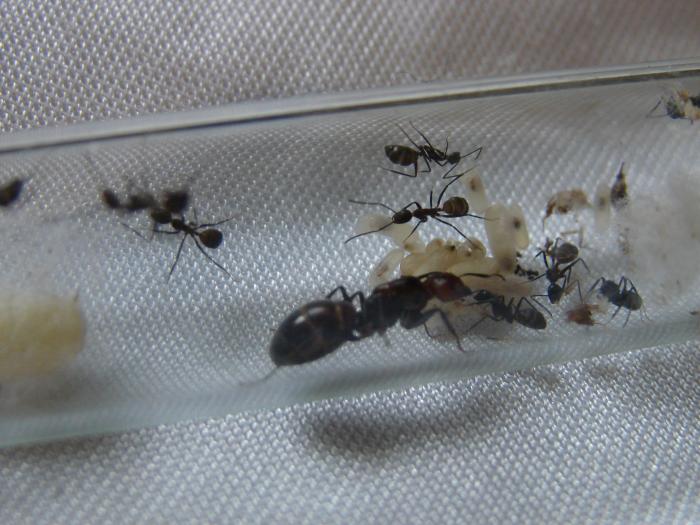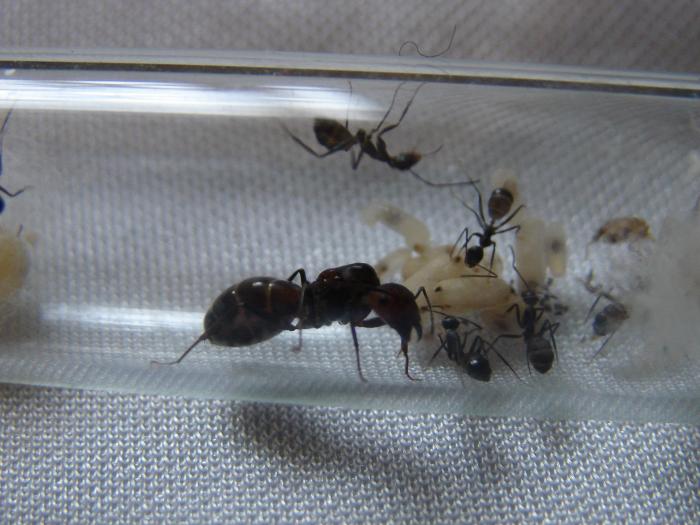 обновляю фотки Polyrhachis sp., предположительно Dives (weaver ants). Одна из личинок уж очень подросла, будет скоро как сама матка), не отстает и еще одна, тоже крупных размеров. Так же наблюдается несколько яиц. Матка охотно ест моль, и медовый сироп. Предполагаю что у них трудный "старт", но потом с ростом численности, как это обычно бывает, будет и "ровное" развитие.