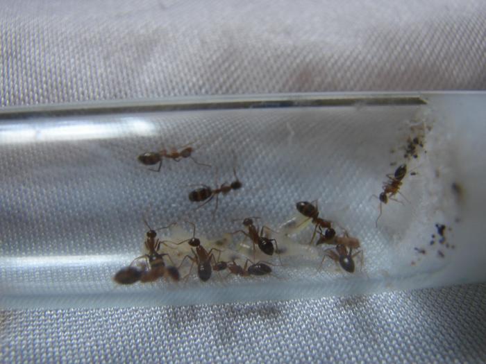 Myrmicaria sp. Матка, 13 рабочих, расплод. Фоток удачных мало, запачкали пробирку, а в чистую и новую переселятся отказываются). Первые муравьи как обычно малы, в природе видел крупнее особей этих "паучков", но у них не так как в кампов и мессоров градация каст, скорее как у людей, кто покрупнее, кто помельче - четких границ нет).