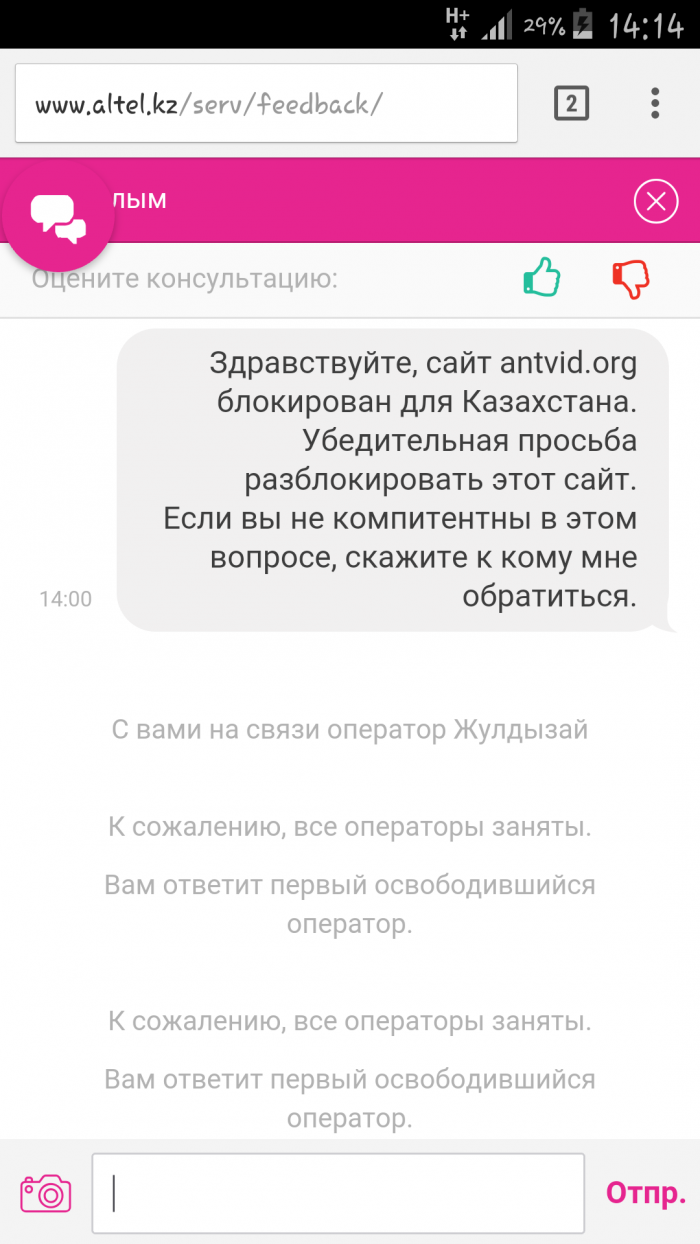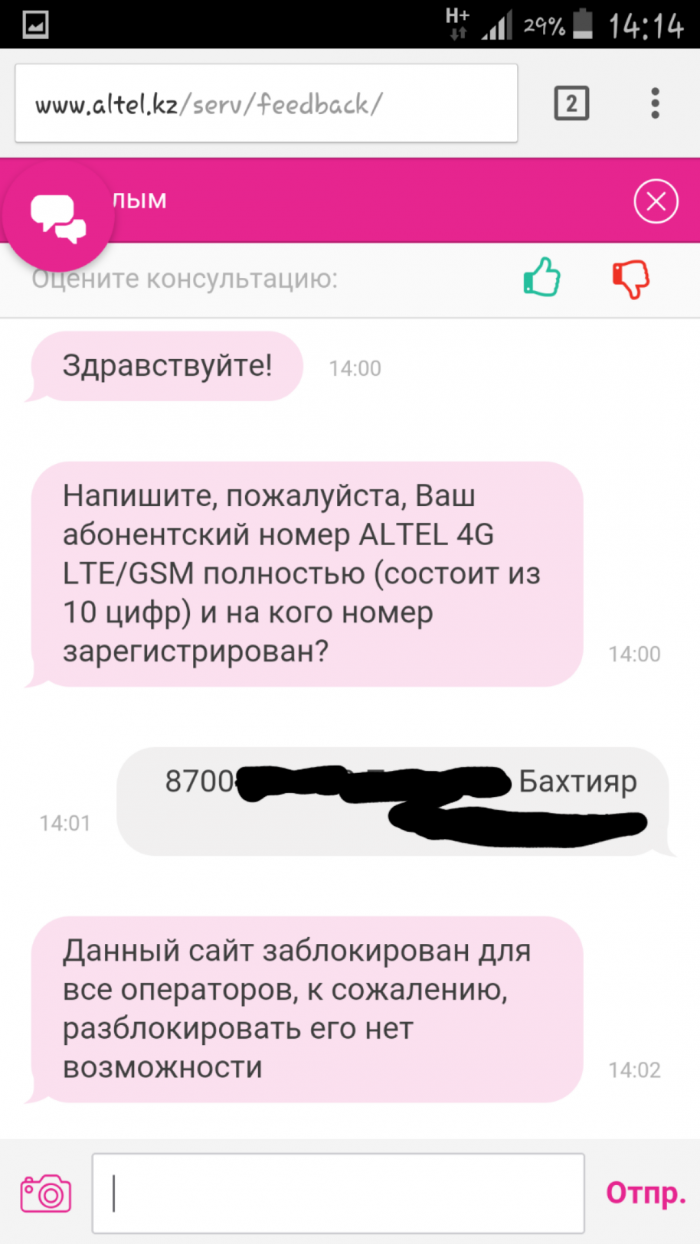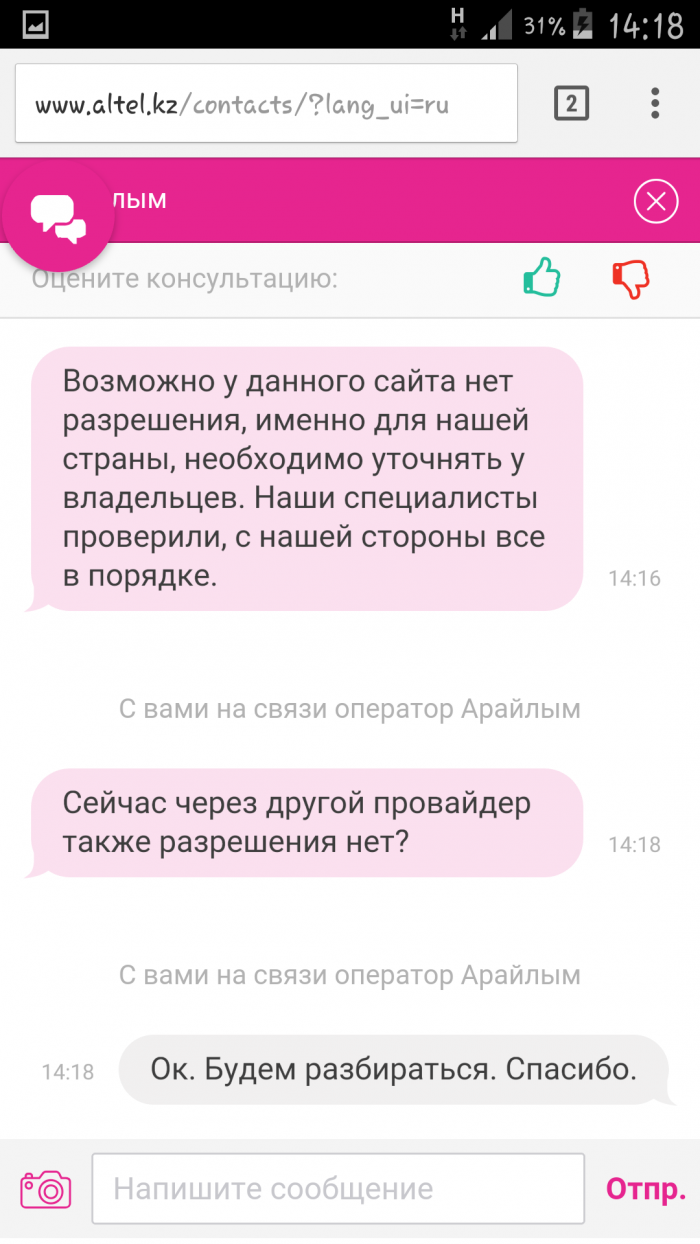 Огромное спасибо за помощь. Удивляет "компетенция" специалистов Алтел. Такое ощущение, что случайных ребят с улицы набрали и они пытаются друг у друга выяснять, что могло случиться и что нужно делать в конкретной ситуации. Удивила фраза про разрешение для конкретно взятой страны. Это что за разрешение? Похоже оператор ляпнул первое, что пришло в голову. Или Казахстан какие-то правила ввёл на своей территории? Тогда вообще все зарубежные сайты должны были бы отключить.