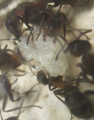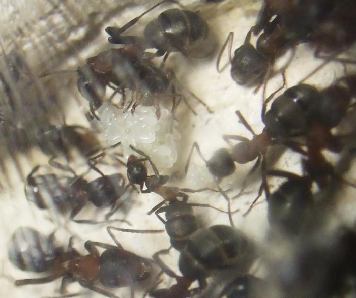 И так, прошло 15 дней после выхода семьи Formica из 60-дневной зимовки, и на утро я обнаружил боооольшой пакет яйиц! В нем находится примерно 50 яичек. Надеюсь выведутся все, а не треть или половина :)
