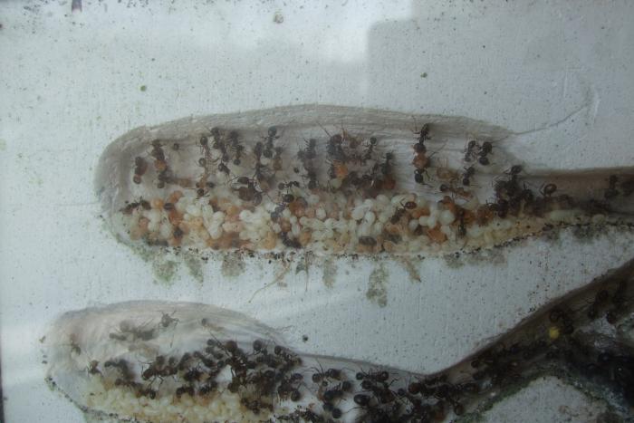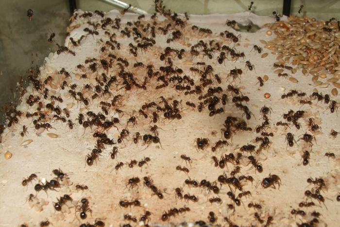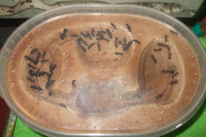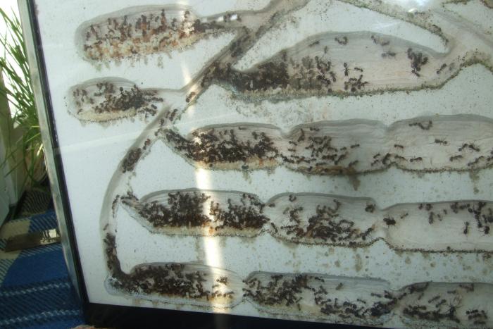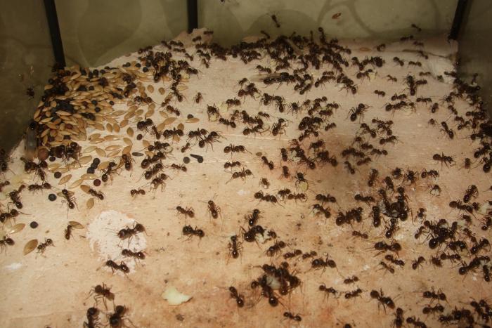 Колонии Messor structor уже 13 месяцев. Голов уже ~1200. Бурное развитие пошло с количества 150 штук - по 100 шт/мес. А потом и вовсе по 200/мес! В формикарии, с других сторон, тоже есть камеры и ходы. Внутрикамерной связи нет, только через арену. Из-за чего там нет запаха королевы и рабочие встречаясь постоянно на арене друг другу откусывают брюшки :( В день по 1-2 штуки в среднем погибает... :(