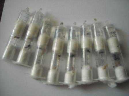 Наконец-то они доехали: отправка 17.08 и прибыли сегодня-последние дня три ежедневно справлялся на почте. Упакованы великолепно, приехали в отличном физическом состоянии, насколько я об этом могу судить. Попили жиденького сиропа медового. Помнится вы говорили, что сутки или более они все вместе в одной трубке сидели. Покалеченных нет, смотрел внимательно. А они мне очень понравились-я их раньше оказывается никогда не видел. А по книгам представлял их себе как других сервиков, только поменьше и чуть "серее." А они чёрные, блестящие и совсем не пугливые: распаковал коробку, выложил на столе в рядок, принёс готового сиропа (раз в сутки делаю) и стал по капельке в инкубаторы--в третий каплю вношу, а в первых двух уже с ваток слезли и топ-топ чапают к капле! Ещё раз огромное спасибо, я ваш должник, напишу в личку. Первое фото с пакетом специально не стал помещать. Наверное буду сильно занят: следующая запись вместе с фотками, как только поселю их в форм-инкубатор.