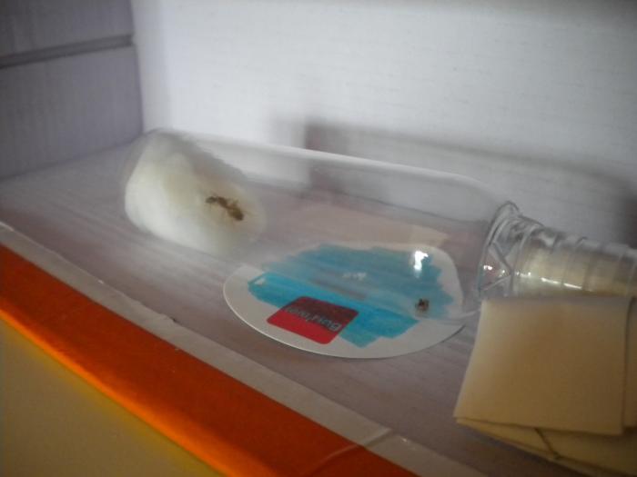 Проблема в том, что долго держать их без формика не смогу. Когда нашел матку пробирки не нашлось и я приспособил пластиковую бутылочку из-под одноразового шампуня. У нее есть горлышко, через которое плотный комок ватки просунуть не удалось, поэтому водной прослойки у меня нет. Приходится раз в 10 дней капать пару миллилитров воды на ватку с помощью трубочки.