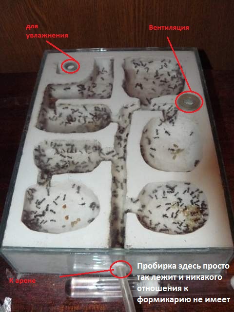 Всем муравьям нужен градиент влажности, чтобы могли выбрать более подходящее для себя место.Камера для увлажнения должна быть где то внизу сбоку если это вертикальный формикарий или с краю в углу если горизонтальный.