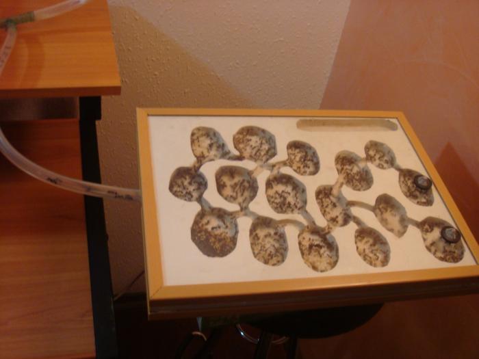 Я их сразу пересадил в большую колбу и подключил арену. Накрыв их полотенцем и дал себе слово, что буду смотреть не чаще чем раз в неделю. Где-то я уже говорил, но мне кажется, что когда муравьи находятся в состоянии покоя и в полной темноте, то чувствуют себя намного лучше и развиваются быстрее (лично проверял и наблюдал этот факт). Кормил немного семенами + давал белковый корм в виде личинок, куриного мяса.