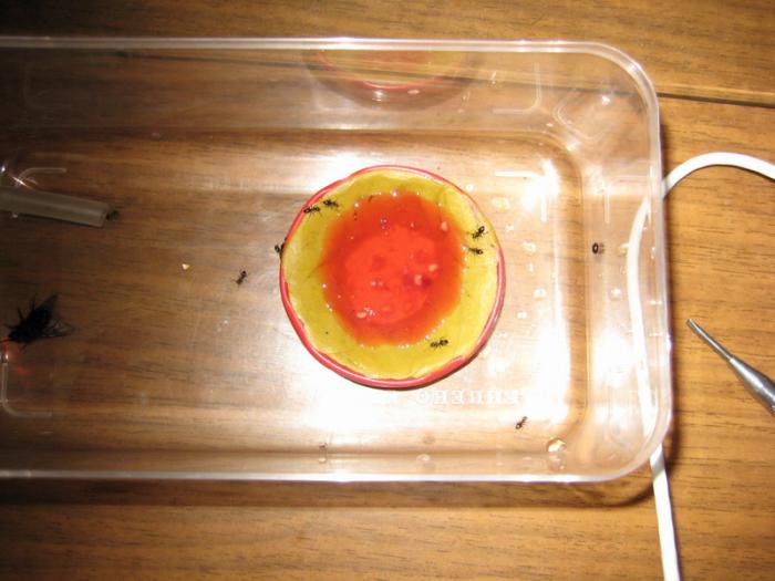 Стеклянная ферма размером 40х30х2 см. закрыта сверху крышкой вырезанной из пластика (вроде полистерол). Ферма соединена силеконовой трубкой с 3х литровой банкой с землёй в которой сообственно и были принесены муравьи. В крышке банки продделаны отверстия для вентеляции и вставлена ещё она трубка ведущая на арену. На арене поилка с сиропом, сделана из крышечки из под кетчупа внутри пластелином сделаны пологии берега, чтобы муравьи не падали в жидкость.