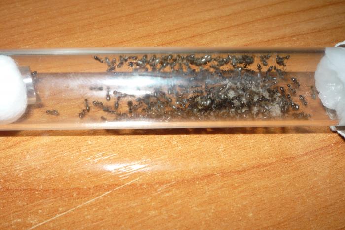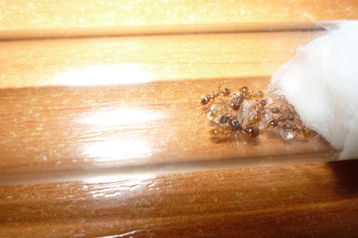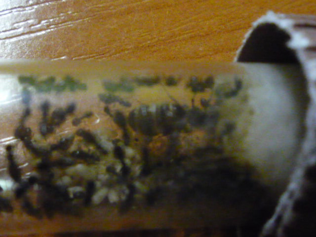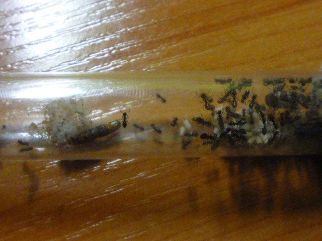 В начале августа мне удалось поймать матку лазиус нигер, она отложила свои яйца только через неделю после поимки, но только через 2 месяца появился 1 рабочий: он был белый и всего боялся, я кормил их дрозофилами и медом они ели, и даже за усиками трещало .Шли годы дни и было все больше и больше яиц, но вдруг когда было 5 первенцев яйца перестали нестись, я усиленно кормил белковой и углеводной пищей личинки росли превращались в куколки, куколки в рабочих. Остовался 1 кокон, а яиц все нет и нет через дня 3 появился еще один молодой рабочий, я покормил всю ораву дрозофилкой и медом, на следующий день обнаружил пакет. Я так думаю матка ждала когда все яйца превратятся в рабочих, а потом снесла пакет когда в семье было 16 рабочих. На данный момент у меня N- ное количество муравьев не могу посчитать, очень прыткие ну и конечно же фото