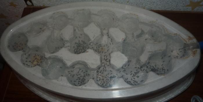 После того как плесень погубила 10 рабочих я начал беспокоится и переселил нигеров в новый формик, переселялись около 20 минут, после переселения прошло 2-х дня, и матка меня обрадовала отложила большую горку яиц + стало в 3 раза больше коконов, кормлю белком раз в 3 дня и капаю сироп, раз в день кушают до раздутия пузика, даже полоски появляются...