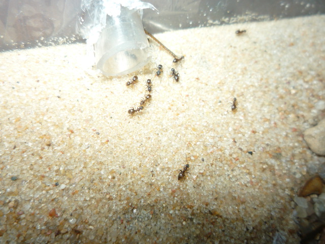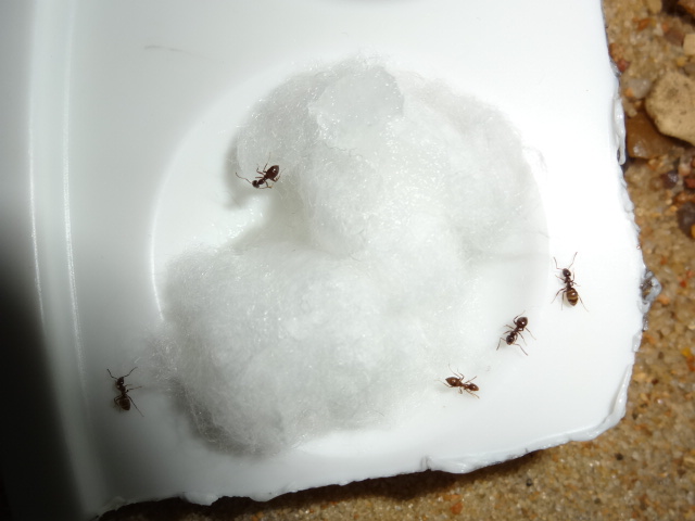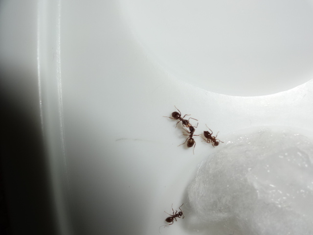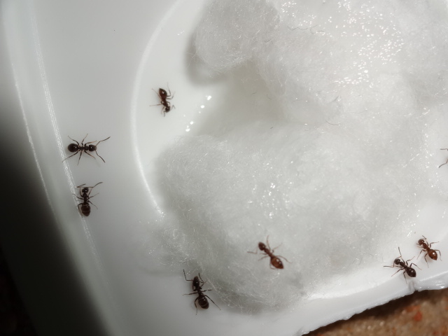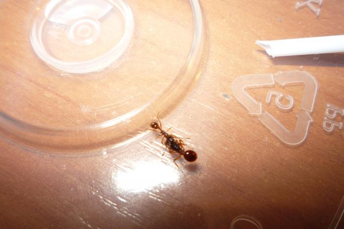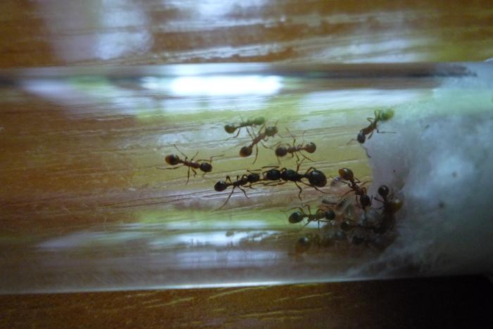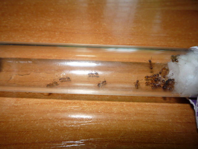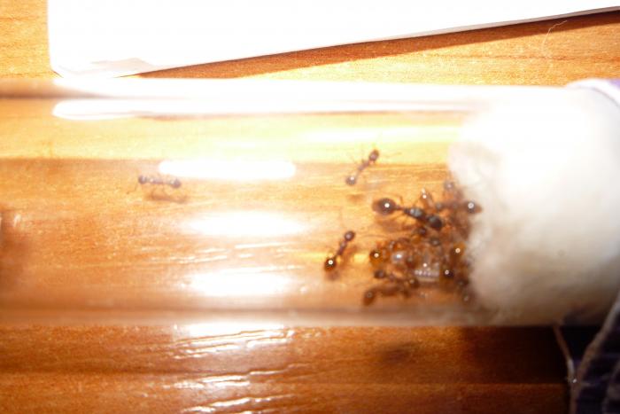 С начало сложновато матка не всегда ела и не откладывалась, с 1 рабочем стало легче в плане кормления, когда 10 штук было стали любознательны, всегда сидели возле входной ватки, чтобы не пропустить кормежку и один всегда выползает и бегает по столу, но далеко не уползает - это не нигеры, которые при 1 возможности бегут, куда глаза глядят. Мирмики спокойные и милейшие существа, советую заводите и не пожалеете...