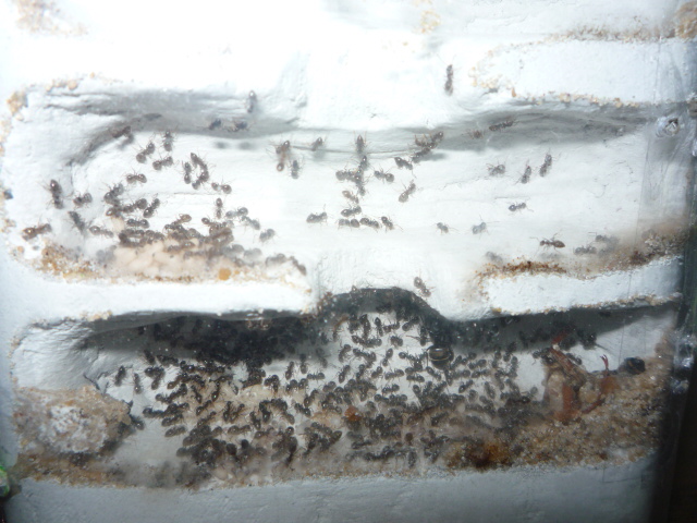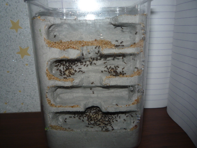 время неумолимо идет, колония растет не по дням а по часам вот и пришлось делать формик, я не заставлял их переселятся не грел не светил просто подключил вормик к арене и сказал сам себе пусть выберают через час фуражиры начали носится туда сюда толкать кусать матку прыгать в прямом смысле прыгать на собратьев прошло еще пол часа и уже не видел не кого в пробирке все были в формике решил увлажнить на последок но переувлажнил и появился конденсат больше не закрываю форм крышкой да и не нужно мурахи не сбегают сидят в камерах выбегают на арену но если все таки решаются подходят к краю а там полоска вазелина нюхают и в истереке бегают была еще 1 нопасть начали грызть формик но я быстро сообразил что им нужен песок и я оказался прав сейчас живут нормально пьют сироп едят белок и потихоньку развиваются только матка худая но нечего откормлю... Вот чуть фоток