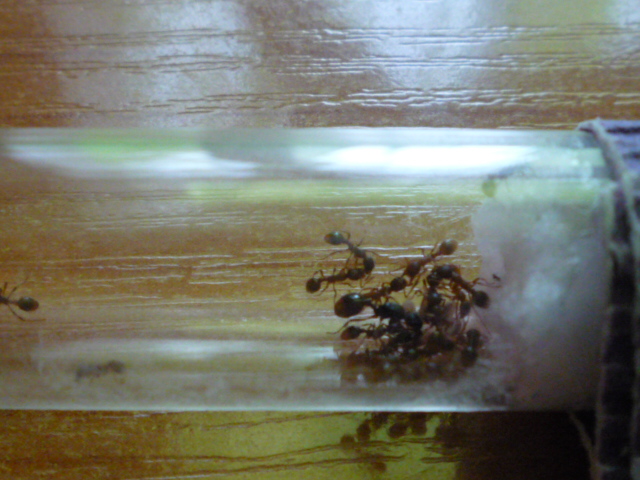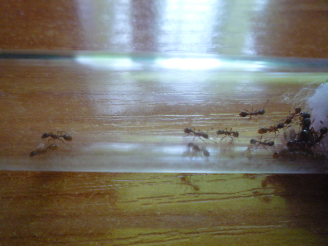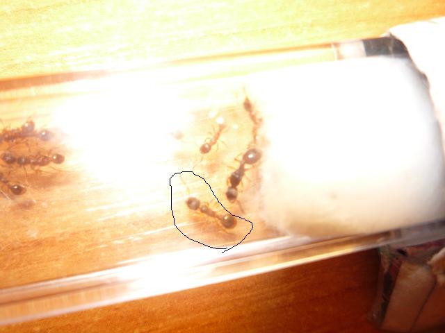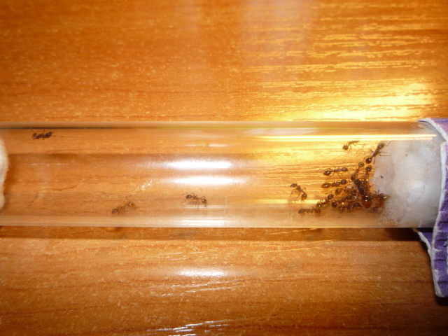 Мирмики живут прелестно, развиваются нормально и почти всегда голодные, бегают около входной ватки и ждут, когда же им дадут сиропа, на который слетаются все и матка, и фуражиры, и няньки... Жизнь кипит, нас уже 19 вместе с маткой =) на радость мне, на зависть Dameozу. И конечно же фото, со вспышкой и без с нового фотоаппарата...