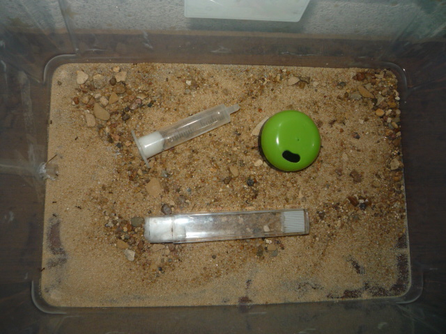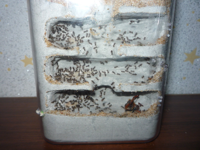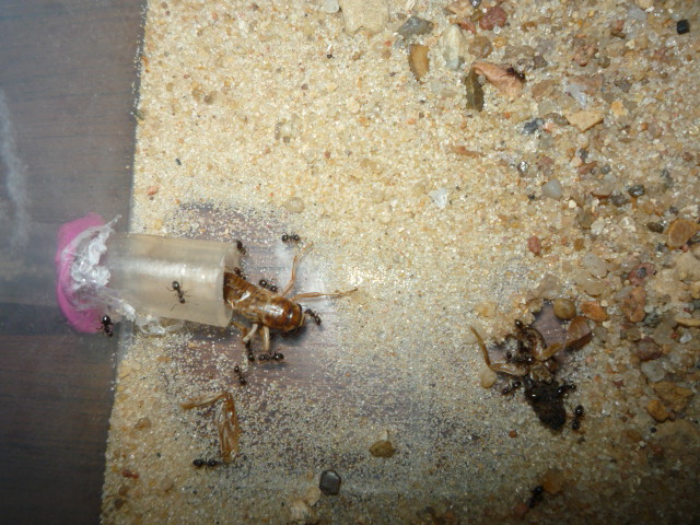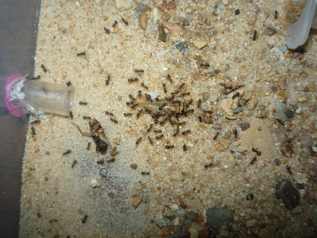 Колония нигеров растет, белком кормлю раз в 2 недели, в качестве белка даю саранчу, появилась в зоомагазине - корм для рептилий. Численность подсчитать не могу, я думаю где-то в районе 300-350 муравьев. Хитин майского жука вынесли на арену, хотел убрать, но срочно вызвали на работу, когда приехал домой хитин обратно занесли в камеру и засыпали песком как не в чем не бывало, слева видите комок? внутри комка брюшко саранчи оставили на черный день, а остальной мусор на арене убираю каждый день, а то захламят формик свинята еще те))) Ну вот и фото...