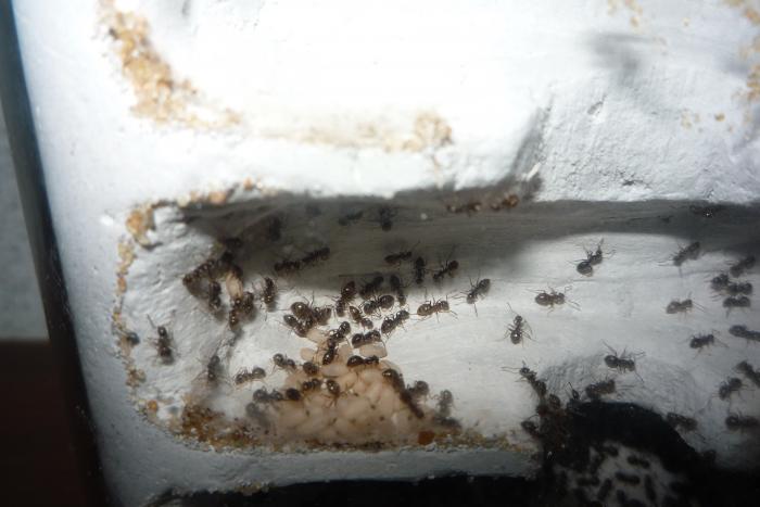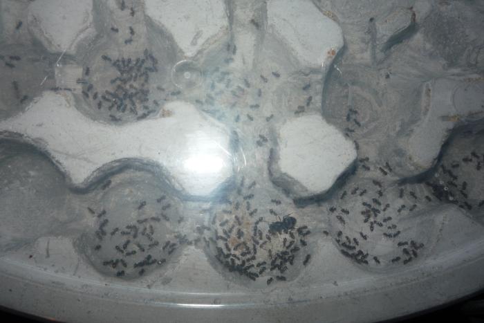 В начале августа мне удалось поймать матку лазиус нигер, она отложила свои яйца только через неделю после поимки, но только через 2 месяца появился 1 рабочий: он был белый и всего боялся, я кормил их дрозофилами и медом они ели, и даже за усиками трещало .Шли годы дни и было все больше и больше яиц, но вдруг когда было 5 первенцев яйца перестали нестись, я усиленно кормил белковой и углеводной пищей личинки росли превращались в куколки, куколки в рабочих. Остовался 1 кокон, а яиц все нет и нет через дня 3 появился еще один молодой рабочий, я покормил всю ораву дрозофилкой и медом, на следующий день обнаружил пакет. Я так думаю матка ждала когда все яйца превратятся в рабочих, а потом снесла пакет когда в семье было 16 рабочих. На данный момент у меня N- ное количество муравьев не могу посчитать, очень прыткие ну и конечно же фото