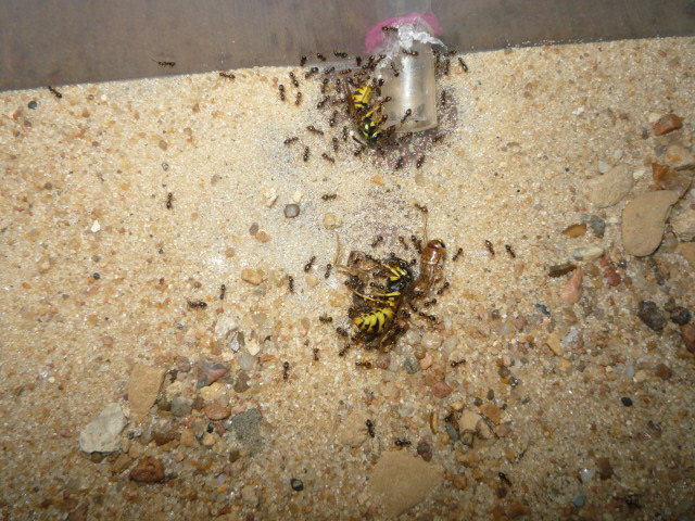Прилетело в квартиру 2 осы, я их убил и подумал, а почему бы не дать муравьям, только кинул на арену началась движуха, вылезли фуражиры понюхали и забежали в форм и начали прыгать на собратьев в формике, звать на помогу ( осы были мертвы на 98%, двигались только ноги) и того вышло около сотни мурах, пока достал фотоаппарат, вставил новые батарейки, половина уже ушла, вот фотографии...